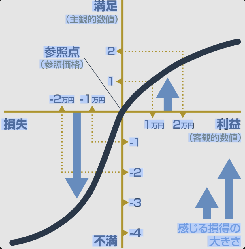 - 利益側(右上の曲線): 0円から1万円に増えた時の「満足(主観的数値)」の上がり幅に比べ、1万円から2万円に増えた時の上がり幅の方が小さくなっています。